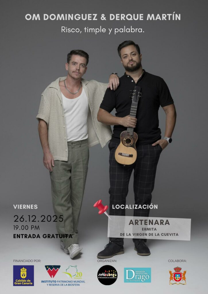 El próximo viernes 26 de diciembre a las 19:00 h, la Ermita de la Virgen de la Cuevita será el escenario de un encuentro muy especial con OM Domínguez & Derque Martín, en su espectáculo “Risco, timple y palabra”.
