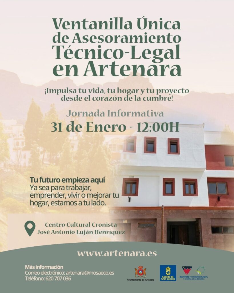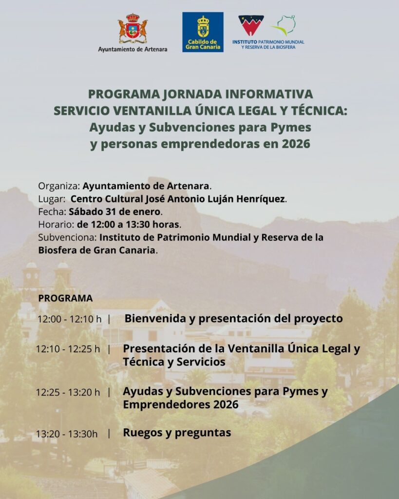 Jornada informativa “Ventanilla Única Técnico - Legal: Ayudas y Subvenciones para PYMES y personas emprendedoras en 2026”, organizada por el Ayuntamiento de Artenara, que se celebrará el sábado 31 de enero, de 12:00 a 13:30 h, en el Centro Cultural José Antonio Luján Henríquez.