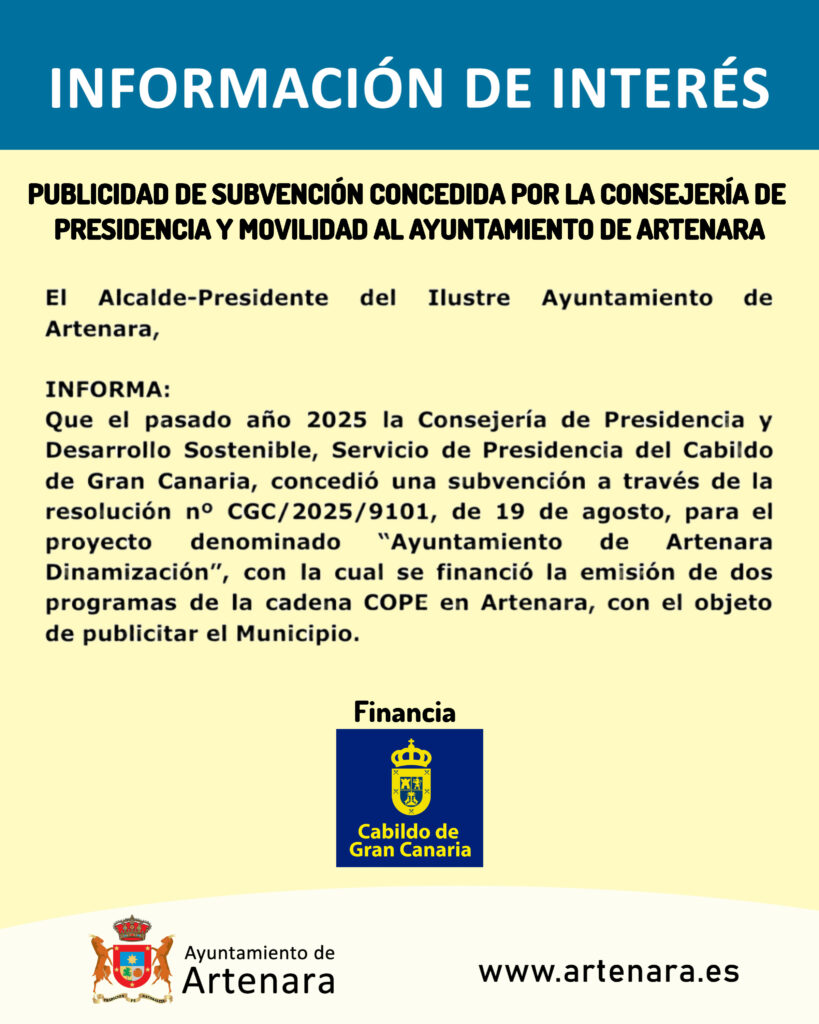 Que el pasado año 2025 la Consejería de Presidencia y Desarrollo Sostenible, Servicio de Presidencia del Cabildo de Gran Canaria, concedió una subvención a través de la resolución nº CGC/2025/9101, de 19 de agosto, para el proyecto denominado “Ayuntamiento de Artenara Dinamización”, con la cual se financió la emisión de dos programas de la cadena COPE en Artenara, con el objeto de publicitar el Municipio.