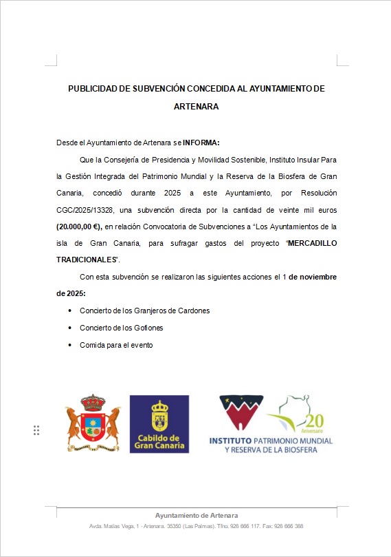 Publicidad de Subvención concedida al Ayuntamiento de Artenara