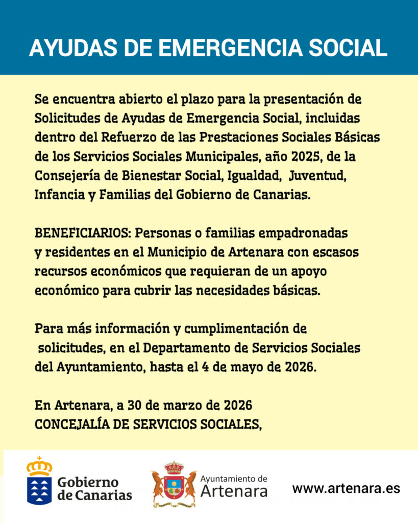 BENEFICIARIOS: Personas o familias empadronadas y residentes en el Municipio de Artenara con escasos recursos económicos que requieran de un apoyo económico para cubrir las necesidades básicas.Para más información y cumplimentación de solicitudes, en el Departamento de Servicios Sociales del Ayuntamiento, hasta el 4 de mayo de 2026.