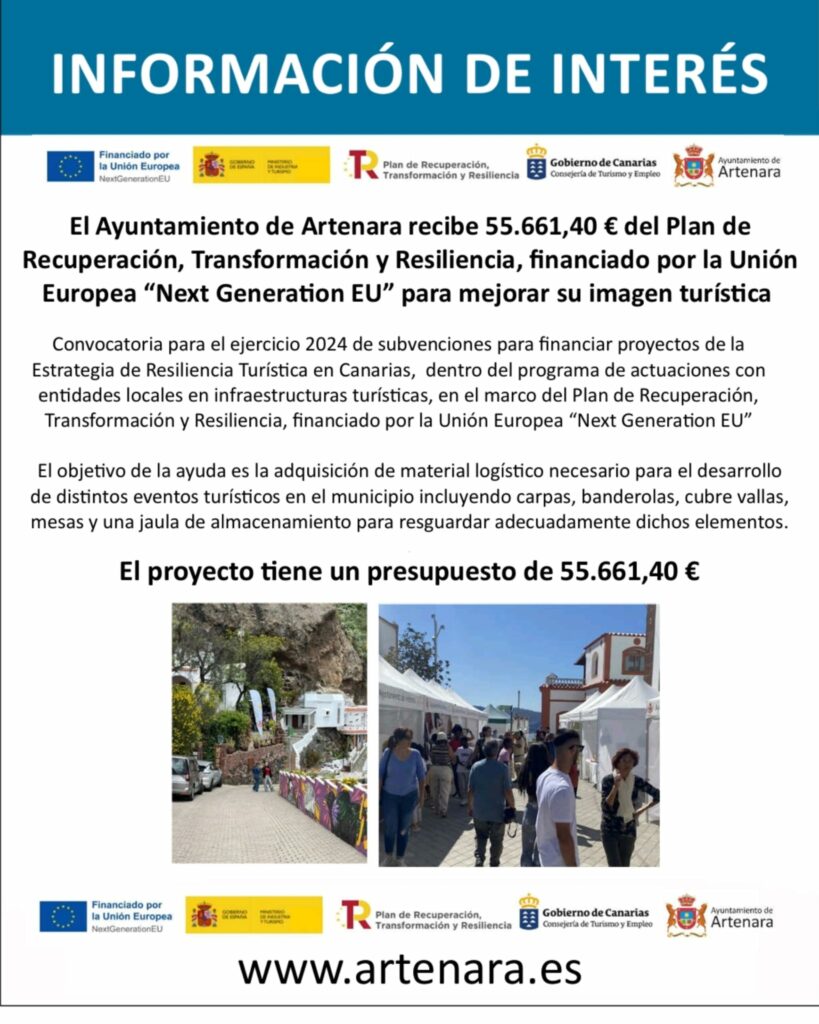 El Ayuntamiento de Artenara recibe 55.661,40 € del Plan de Recuperación, Transformación y Resiliencia, financiado por la Unión Europea “Next Generation EU” para mejorar su imagen turística.