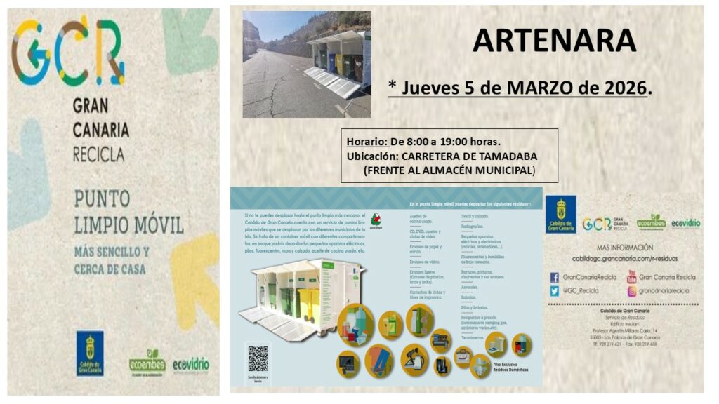 El próximo jueves 5 de Marzo de 2026, el servicio de Gran Canaria Recicla estará en nuestro municipio para que puedas depositar de forma cómoda y gratuita aquellos residuos que no deben ir a los contenedores habituales: pequeños electrodomésticos, pilas, bombillas, aceite usado, ropa, cartuchos de tinta, radiografías y mucho más.