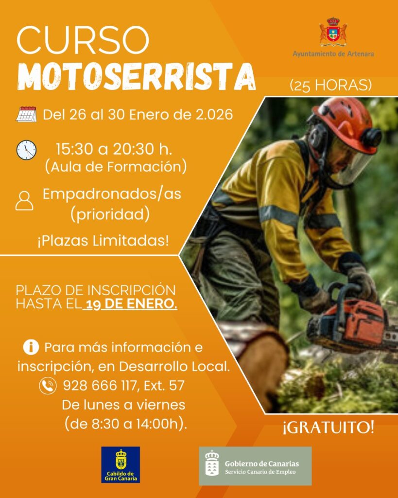 El Ayuntamiento de Artenara organiza un Curso de Motoserrista dirigido a personas interesadas en mejorar su formación y ampliar sus oportunidades laborales.