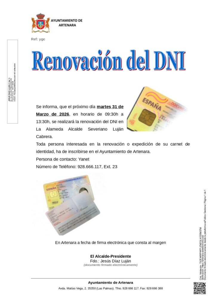 Todas las personas interesadas en renovar o expedir su Documento Nacional de Identidad deberán inscribirse previamente en el Ayuntamiento de Artenara.